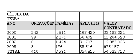 No mesmo âmbito de articulação política foi promulgada a Lei Complementar nº 93, de 4 de fevereiro de 1998, que constituiu o Banco da Terra. Era um fundo de doações realizadas por entidades nacionais ou internacionais, públicas ou privadas, cuja finalidade era financiar programas de reordenação fundiária e de assentamento rural, através, de acordo com o Decreto nº 2.622, de 9 de junho de 1998, da compra e venda de imóveis rurais. Podemos analisar através das tabelas (1 e 2), que o programa Banco da Terra entre os anos de 200 e 2003, foi mais eficaz que o Cédula da Terra.