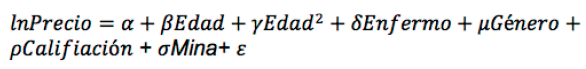 El modelo estadístico que utilizamos para un análisis formal del precio de los esclavos en el Caribe neogranadino tiene como variable dependiente el precio del esclavo y como variables independientes la edad, la edad al cuadrado, y las variables dicotómicas, que toman valores de cero o uno, para el estado de la salud,5 género, si era calificado o no y si trabajaba en una mina o no: