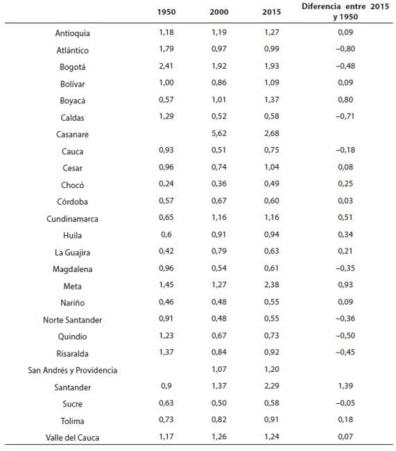 En el conjunto de las regiones colombianas, los departamentos caribeños no son los más pobres si se los compara con los de la Costa Pacífica, en particular con Chocó, Cauca y Nariño. En 2015, Bolívar presentó un ingreso por habitante del 9%, superior al promedio y el de Atlántico fue igual, aunque en 1950 era uno de los más ricos del país (un 80% superior al promedio); Cesar está un 5% por encima, pero Magdalena, Córdoba, La Guajira y Sucre están bastante por debajo del resto. Los departamentos cafeteros también se han empobrecido considerablemente, mientras que Antioquia y Valle del Cauca se mantienen arriba, pero los departamentos de Santander (un 150% más que el promedio, gracias en parte al petróleo) y Bogotá (93%) son los más ricos, descontando a los nuevos productores de petróleo (Meta y Casanare) que generan muchas más rentas y utilidades que salarios y empleo. Igual sucede con las regiones productoras de carbón y níquel, en una magnitud similar a las que producen oro en forma industrial. Más adelante, examino las disparidades regionales con mayor detalle.