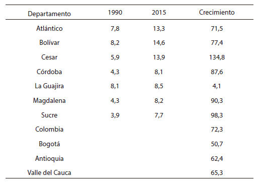 La evolución del PIB per cápita muestra algunas diferencias interesantes entre la región y el promedio nacional. Solo Atlántico y de lejos La Guajira muestran un crecimiento inferior al del PIB per cápita nacional. Cesar registra el mayor crecimiento, seguido de Sucre, Magdalena y Córdoba. Todos ellos, excepto La Guajira, superan el crecimiento de Bogotá y de Antioquia y Valle (tabla 4).