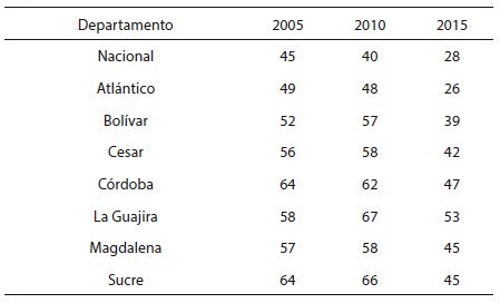 Con respecto a la pobreza monetaria, Atlántico es el único que muestra un resultado mejor que el promedio nacional; todos los demás siguen siendo más wpobres a pesar de que se observa un rápido progreso de los más rezagados. Persisten, entonces, índices de pobreza muy agudos que reflejan las relaciones ancestrales de desigualdad entre las élites, los campesinos y las grandes corrientes de desplazados que se refugian en los barrios marginales de sus ciudades.