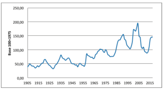 La gráfica de la tasa de cambio real muestra que hubo una revaluación sostenida del peso entre 1921 y 1927, una devaluación durante la Gran Depresión y una nueva fase de fuerte revaluación entre 1935 y 1955. De ahí en adelante la devaluación del peso fue significativa, con períodos revaluatorios en la década de 1990 y entre 2004 y 2014 que revivieron la enfermedad holandesa y contribuyeron a la desindustrialización de Bogotá, Cali, Medellín y Barranquilla, pero no de Cartagena. Por lo demás, el triángulo de oro generaba externalidades y menores costos de transporte que las ciudades de la Costa Caribe. La irregularidad de la navegación por el río Magdalena y el fracaso del Ferrocarril del Norte, junto a las dificultades de acceso al puerto de Barranquilla, aislaron la Costa Caribe de los impulsos provenientes del triángulo industrial del interior.