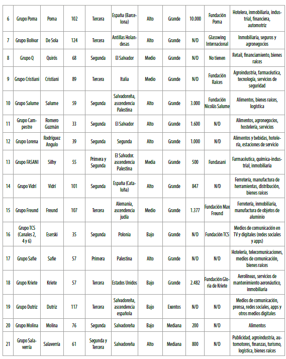 Para comprender el origen y la situación actual de los GEFS que se presentan en este documento, es necesario primero considerar la historia sociopolítica y económica del país, dentro de la cual pueden identificarse claramente cinco grandes períodos: la Colonia (1524-1821), la post Independencia con gobiernos civiles intermitentes (1821-1928), los gobiernos militares (1928-1980), la guerra civil (1979-1989) y la democracia (1992 a la fecha). Durante el segundo período de post Independencia se sitúa el origen de las actividades de influencia política y económica de las familias Álvarez, Dueñas y Regalado, hoy vinculadas también a familias propietarias de Grupo Agrisal, Grupo Cassa, Grupo Poma y Grupo Kriete. El cultivo, procesamiento y exportación de café fue lo que permitió a estas familias, y a otras que conformaban esta élite agroindustrial, acumular el suficiente capital para posteriormente expandirse a otros sectores. En ese período también se establecieron (o iniciaron) en el país, con sus actividades económicas, familias extranjeras que, como se aprecia en la tabla 1, no se arraigaron en la agroindustria sino en otros sectores. Si bien en un inicio estas familias extranjeras no formaron parte de la élite local, poco a poco fueron creciendo empresarialmente, vinculándose con las anteriores u otras que estaban ya establecidas en el país, de manera muy similar a lo sucedido en otros países de Latinoamérica (Cerutti, 2006, citado en Dávila et al., 2021).