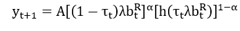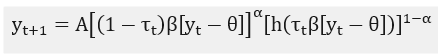 The variable on the vertical axis is measured in overall future productivity per worker units . It depends on the current productivity level per worker .[3] The current labor productivity per worker, in turn, is a function of both the current tax rate and aggregate intergenerational transfers . Each lower case represents the intergenerational transfers from the wealthy capitalist class and the poor working-class .