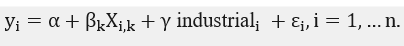 [Ec. 4]where is the measure of educational investment in a particular Prussian city, according to German the census of 1907; is the common intersect; is the matrix of control variables; the corresponding vector of coefficients; industrial the variable that measures industrial employment in city . Finally, corresponds to the estimated rate of change in education expenditure when a marginal change in industrial employment occurs and is the error term.