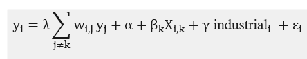 To account for this, the author decided to build a GS2SLS model that included the spatial lag for the dependent variable by adding the industrial employment in every other city and the neighboring structure of (embodied in ) to the original model. When placed together, these variables created a weighted average of adjacent cities’ influence on the dependent variable (Hollenbach, 2019, p. 16). The author’s proposed equation for this new model was: