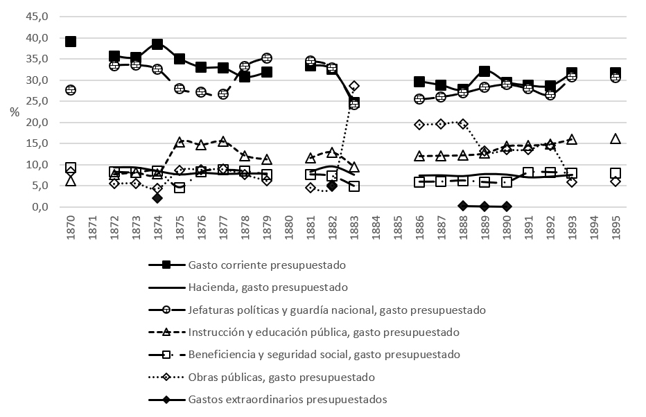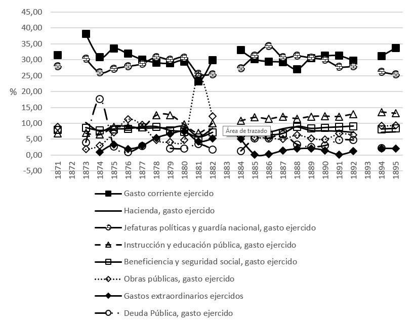 En este sentido, la primera línea que descolló es la que articuló el financiamiento presupuestado al gasto corriente, tal como puede apreciarse en la figura 4, la cual representa el porcentaje que ocupó cada una de las partidas programadas por la administración en turno. De acuerdo con ella, el gasto proyectado para el sostén del aparato estatal alcanzó números sobresalientes y estables, con un ligero descenso sostenido durante la segunda mitad del decenio de 1870 y presentando su mayor recorte presupuestal en 1883, para luego comenzar a enfilarse hacia los niveles anteriores de la década, pero enseguida ajustar sus cifras en 1888 a partir de los estremecimientos del mercado extractivo y exportador del tintóreo natural, y posteriormente incrementar su gasto programado gracias a las modificaciones en la tributación indirecta, como preparativos para la abolición de la alcabala doméstica y a las mejores expectativas del mercado de colorante. En consecuencia, el gasto corriente presupuestado continuó escalando, esta vez con paso firme desde 1893, con pisos superiores al 30%, recuperándose así la propensión del periodo de 1870.