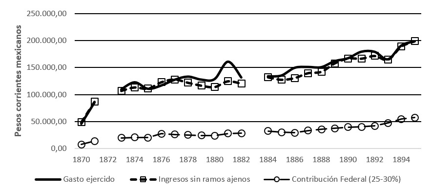 Así, en una panorámica de conjunto, como puede apreciarse en la figura 1, los ingresos ordinarios sin contabilizar los ramos ajenos —estos últimos producto de recaudaciones por concurrencia tributaria con la federación y los municipios— mantuvieron una vinculación con los gastos ejercidos en valores de crecimiento y tamaño, salvo los años iniciales de la década de 1880 que demandaron recursos extraordinarios del erario debido a las plagas de langostas en los campos, originando una crisis maicera por desabastos con actos violentos, y a la caída de los precios del tintóreo (Negrín, 1991a, p. 116; Quiñones & Salavarría, 2003, p. 139; Zarauz, 2003, p. 278).
