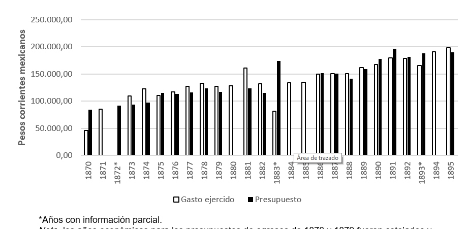 Nota: se priorizó la comparativa para años con información presupuestal y ejercida completa, salvo 1893 por la carencia de un mes para el egreso ejecutado.