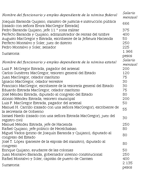 En cuanto a los funcionarios dependientes de la nómina federal, como puede apreciarse, despuntan ciertos personajes de la cúpula del barandismo, comenzando con la figura visible del ministro porfirista de justicia e instrucción pública, Joaquín Baranda, y sus hermanos, a quienes ubicó en cargos de relevancia militar y tributaria en el territorio campechano, esta última en la administración de la cada vez más importante renta del timbre. Asimismo, los hermanos Montalvo y Soler detentaron cargos de la judicatura federal, convirtiendo en la época al juzgado de distrito en un brazo de acción política al servicio de la facción barandista contra sus rivales, especialmente el grupo del castillismo (Negrín, 1991a, pp. 111-112). De manera que estos empleados no dependían de los fondos del erario estatal, pero sí ocuparon plazas de influencia estratégica en la entidad a partir de las prácticas articuladas por el sector político predominante.