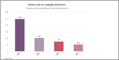 Com esses dados é possível deduzir, por exemplo, o porquê do grande número de zero ou baixas em redações do ENEM, em que o entendimento do assunto proposto e a produção da estrutura do gênero dissertação-argumentativa não são atingidos. O gráfico a seguir, apresentado no site G1 Educação faz um levantamento de comparação entre 2014 a 2017 sobre o número de alunos que tiraram nota mil, a pesquisa foi realizada pela INAF.