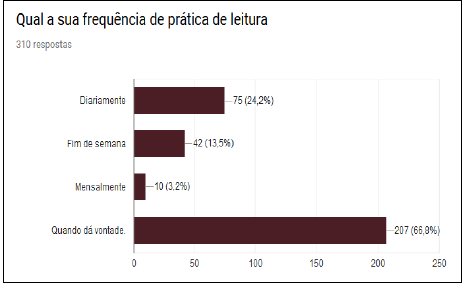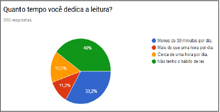 Foi feito também no início do ano de 2018 uma pesquisa através de um questionário produzido no Google drive. Todas as turmas do turno da manhã e da tarde participaram e foram 310 respostas, para um total de 1500 alunos. As perguntas estão relacionadas aos hábitos de leitura dos alunos.