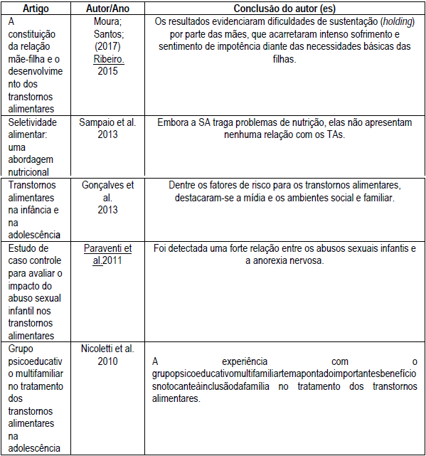 Os textos selecionados abordam as TAs explicando qual a sua relação com os cuidados maternos e com outros acontecimentos como o abuso sexual. Para Moura, Santos (2017) e Ribeiro (2015) a forma como a mãe se portou diante da filha nos seus primeiros anos de vida vai refletir no seu desenvolvimento e algumas vezes essa relação de desvelo da mãe pela filha pode trazer consequências como um TA.