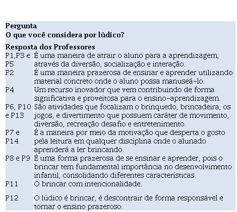 As questões da investigação proposta na realização da entrevista aos professores da Escola Municipal Professora Edneide Sales Campelo foram estruturadas com a intenção de responder com maior clareza os objetivos da referida pesquisa. Para iniciar a entrevista é muito importante ter a informação se os professores conhecem sobre o significado termo lúdico e para melhor esclarecimento foi elaborada a 1ª questão da entrevista: O que você considera por lúdico? A resposta da referida pergunta está ilustrada na tabela abaixo: