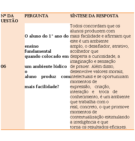 De acordo com que foi analisado no esquema acima, é fácil verificar que para os educadores do 1º ano do ensino fundamental da Escola Municipal Professora Edneide Sales Campelo, um ambiente lúdico é fundamental para facilitar a aprendizagem, propiciando a interação e socialização de conhecimento entre as crianças no ambiente escolar, transformando o ensinar em algo divertido, dinâmico, criativo e produtivo. Levando, portanto, a criança alcançar de forma prazerosa uma aprendizagem de qualidade e significativa para o seu a crescer como pessoa sociável.