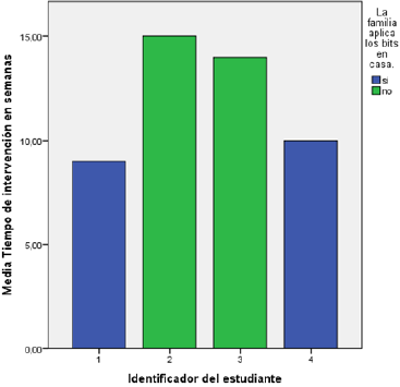 Uno de los primeros resultados que encontramos es la diferencia existente en el tiempo máximo al que acudieron a las sesiones. Podemos observar estos datos en la figura 1. Los cuatro niños utilizan los bits en las sesiones con la logopeda y de forma complementaria las familias aplican los bits en casa únicamente con los niños 1 y 4, sombreados en las columnas de color azul; paradójicamente estos mismos niños son los que menos tiempo de intervención en general han tenido unas 9 semanas. Sin embargo, los participantes 2 y 3 no han utilizado los bits en casa, pero han recibido en general mayor tiempo de intervención. Los participantes han cooperado en el procedimiento durante un mínimo de 9 semanas y un máximo de 15 semanas. Han utilizado los bits de inteligencia en las sesiones de intervención logopédica y en casa durante una media de 12 semanas (σ=2.94).