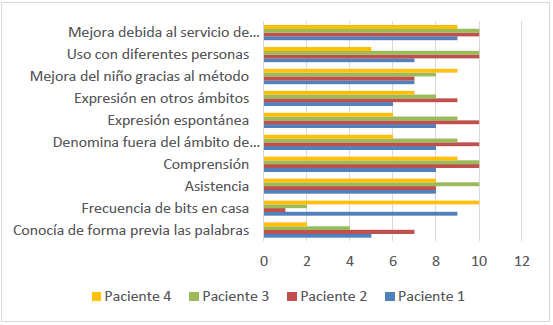 El cuestionario consiste en una escala tipo Likert de 10 puntos, en el que (1) representa la puntuación más baja/lo menos frecuente, y el (10) la máxima frecuencia. El cuestionario consta de 10 ítems (p.e. “Conocía de forma previa a la utilización del método las palabras expuestas”) donde los familiares tienen que marcar con una X la frecuencia que consideren más apropiada. El cuestionario se lleva a cabo durante la última sesión de intervención, cuando finaliza la sesión de sus hijos. El cuestionario valora la importancia que atribuyen los familiares a los especialistas del lenguaje, la eficacia del método, la frecuencia con la que aplican los bits en casa y la estimación de la mejora que encuentran en sus hijos.