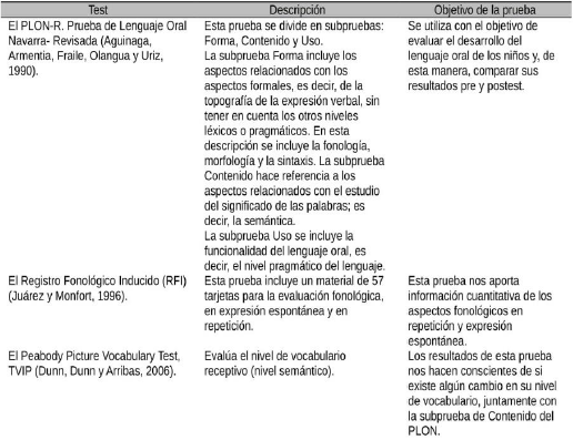 Fase 3: Evaluación final: en esta fase se vuelven a aplicar las tres pruebas estandarizadas que se pasaron en la Fase 1, con la finalidad de comprobar si los niños han mejorado en el nivel fonológico-fonético, semántico y pragmático. En esta misma fase, y una vez finalizada la intervención, se les presenta a los padres el cuestionario para que valoren el proceso llevado a cabo.