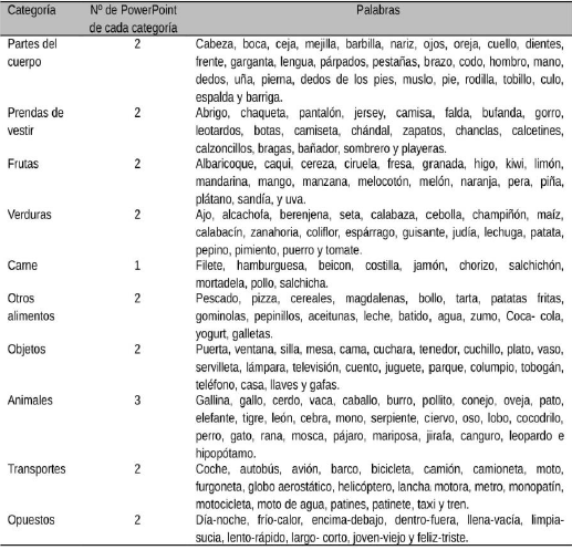 Se empleó la herramienta PowerPoint de Microsoft office 2010 para diseñar los bits de inteligencia siguiendo las líneas determinadas por Doman y Doman (1998). Cada PowerPoint está compuesto por 10 ítems, donde se incluyen 10 categorías semánticas, divididos en un total 21 PowerPoint. Se añadió voz a cada categoría semántica con el objetivo de homogeneizar la aplicación del programa, usando el mismo tono de voz y misma metodología con todos los niños. En la Tabla 2 se muestran las categorías y las palabras que forman parte del programa.