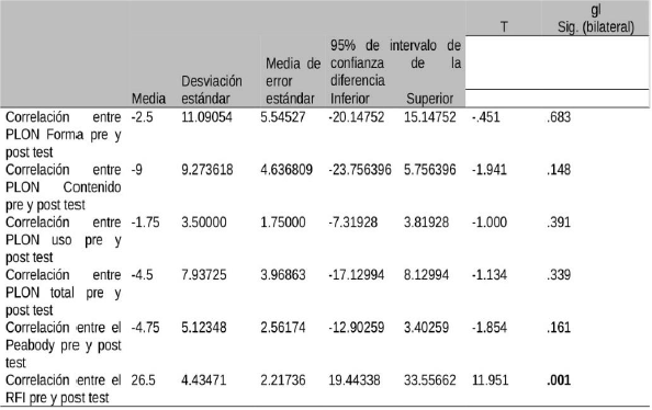 Los resultados nos muestran que son similares en los cinco primeros pares: los resultados totales del PLON (P-Valor 0.339 > 0.05) y las subpruebas de esta misma prueba: Forma (P-Valor 0.683 > 0.05), Contenido (P-Valor 0.148 > 0.05), y Uso (P- Valor 0.391>0.05); también ocurre con la prueba de Peabody (P-Valor 0.161 > 0.05). En todos estos casos, al ser mayor el valor que 0.05, tenemos que rechazar nuestra hipótesis y afirmar que no hay una diferencia en las medidas de las pruebas antes y después de la intervención. Sin embargo, sí que existen diferencias entre la media ponderada previa y posterior de cada una de las pruebas, pero dicha media no es significativa.