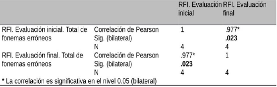 En el análisis de correlación de Pearson del RFI, (Tabla 4) vislumbramos que la correlación es significativa ya que p valor (sig, bilateral) 0.023 < 0.05, por lo que hay una correlación positiva entre las dos pruebas, algo que no ocurre entre las anteriores. A través de la correlación de Pearson, también se realizaron otro tipo de correlaciones como la relación que existe entre el tiempo de intervención en semanas y los datos de la evaluación final de Peabody, que han sido positivos (p valor 0.001 < 0.05), al igual que la correlación positiva entre el puntaje del Peabody al inicio del tratamiento y la subprueba Contenido del PLON al inicio del tratamiento (p valor 0.05 = 0.05). Existen más correlaciones positivas entre pruebas como la subprueba Contenido del PLON al inicio del tratamiento y los resultados iniciales del RFI (p valor 0.45 < 0.05). Lo mismo ocurre con los resultados iniciales y finales de la subprueba Uso del PLON (p valor 0.33 < 0.05) y los resultados iniciales y finales total del PLON, que tienen una correlación de p valor 0.045 < 0.05.