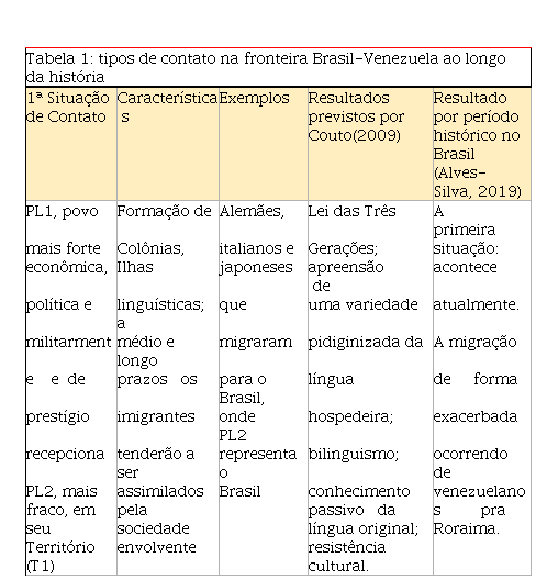 Uma segunda situação de contato ocorre quando o povo mais forte politica e economicamente se desloca para uma região cujo povo é mais frágil visando estabelecer domínios, a exemplo do que aconteceu na América do Sul, na fase de dominação europeia. Uma terceira situação de contato se dá quando dois povos, independentemente de quais deles seja o mais forte ou mais fraco, buscam se estabelecer numa mesma região ou território, geralmente uma ilha. E, finalmente, uma quarta situação de contato que é a caracterizada pelos deslocamentos sazonais e mútuos de povos de duas regiões, podendo-se afirmar haver uma situação de complementariedade comercial e mesmo de lazer. A seguir tem-se a Tabela 1, adaptada de Alves (2012), que mostra como se deu esse contato de povos e línguas na região de fronteira Brasil-Venezuela e os possíveis resultados., considerados os períodos históricos.