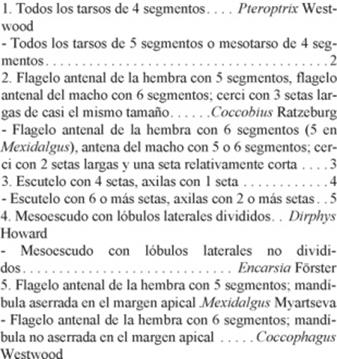 De los 13 géneros y 4 tribus de Coccophaginae que existen (Hayat 1998), en México se han encontrado 6 géneros y 3 tribus (la tribu Euxanthellini no se ha colectado), incluyendo el género Mexidalgus descrito en 2014 (Myartseva et al., 2012, 2014). Los géneros Encarsia (108 especies) y Coccophagus (30 especies) son los más diversos, estando más ampliamente distribuídos en México que los otros géneros (Cuadro 1).