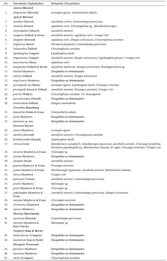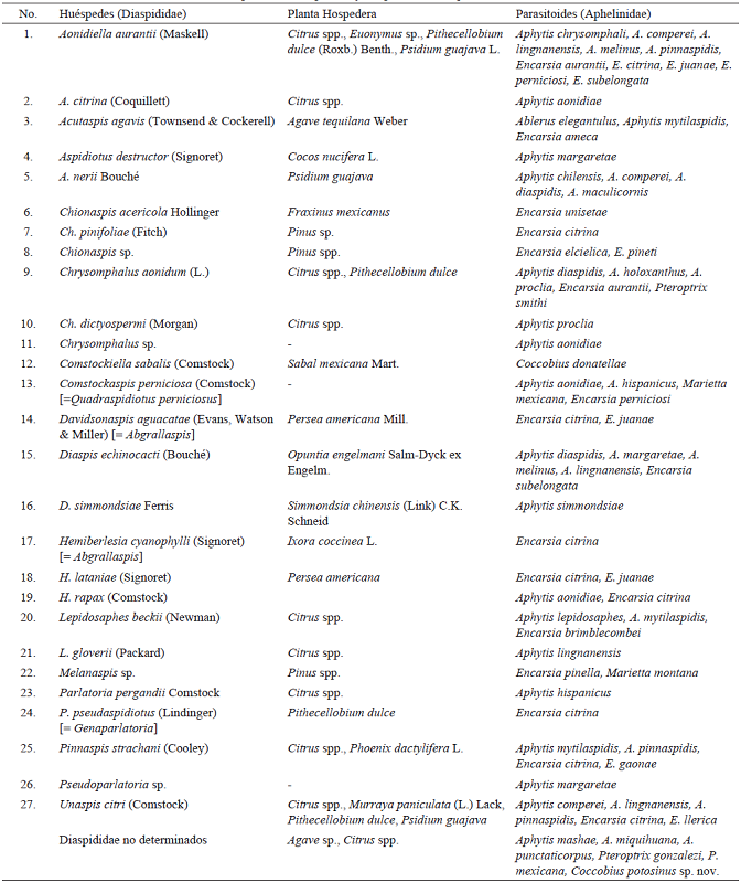 Según los datos de la colecta del material examinado y el análisis de las publicaciones, en México se han identificado 44 especies de cinco géneros de Aphelinidae como parasitoides de 27 especies de Diaspididae (Cuadros 1 y 2), excluyendo los dos géneros hiperparasitoides, además se han recolectado 12 especies de Aphelinidae que han emergido de Diaspididae no determinados.