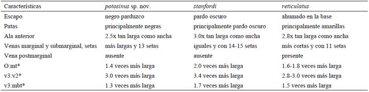 Comentarios.Coccobius potosinus sp. nov., fue identificada erróneamente como C. stanfordi (Howard), una especie distribuida en Estados Unidos (Myartseva, 2000). En la clave de (Hayat, 1984), la nueva especie queda como C. stanfordi mientras que en la clave de (Hayat & Khan, 2010) llega a la especie oriental C. reticulatus (Compere & Annecke). Ambas pueden separarse de la nueva especie por las características del escapo, patas y alas que se describen en el Cuadro 3.
