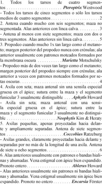 De las 44 especies de Aphelinidae que son parasitoides de Diaspididae en México, 18 especies nuevas de cuatro géneros fueron descritas por los presentes autores en la última década. A continuación se presenta la clave para los géneros de Aphelinidae que atacan escamas armadas en México.