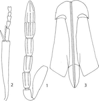 Estructura. Cabeza tan ancha como el mesosoma, ligeramente más ancha que alta. Frontovértice 0.5 veces tan ancho como la anchura de la cabeza, con escultura transversal elongada reticulada y setas erectas. Distancia entre el ocelo posterior y el ojo tan larga como el diámetro de un ocelo. Ojos 1.6 veces tan largos como las mejillas. Antenas (Fig. 1) insertadas inmediatamente debajo del nivel del margen inferior de los ojos. Distancia entre tórulos más o menos tan larga como la distancia y aproximadamente 0.6 veces tan larga como la distancia al ojo. Antena con radícula 2.5 veces tan larga como ancha; escapo 3.5 veces tan largo como ancho; pedicelo más o menos 1.4 veces tan largo como ancho y visiblemente más corto que el segmento funicular 1, el cual es aproximadamente 2 veces tan largo como ancho; segmento 2 un poco más largo y más ancho, 1.7 veces tan largo como ancho; segmento 3 un poco más largo y 1.8 veces tan largo como ancho; maza con el segmento 1 más o menos tan largo como el segmento funicular precedente pero más ancho y 1.3 veces tan largo como ancho, segmento apical 1.5 veces tan largo como el basal; segmentos funiculares con 2 sensilas longitudinales cada uno; segmentos de la maza con 4 sensilas cada uno. Lóbulo medio del mesoescudo con muchas setas delgadas, dos setas en el margen basal, más largas y fuertes. Escultura fina celular reticulada, puede ser vista a mayor magnificación. Escutelo ligeramente más corto que el mesoescudo con 6 setas, su escultura longitudinalmente estriada. Axila con una seta, lóbulo lateral con 2 setas. Ala anterior 2.5 veces tan larga como ancha, su fleco marginal 0.1 veces tan largo como la anchura alar; vena submarginal con 10 setas a lo largo de su margen anterior; vena marginal ligeramente más larga y con 13 setas a lo largo de su margen anterior; vena postmarginal ausente. Espuela de la tibia media (Fig. 2) ligeramente más corta que el basitarso, el cual es tan largo como los dos segmentos tarsales siguientes juntos. Ovipositor (Fig. 3) ligeramente expuesto, 1.4 veces tan largo como la tibia media; válvula 3 es 0.3 veces tan larga como el valvífer 2 y 1.3 veces tan larga como el basitarso de la pata media.