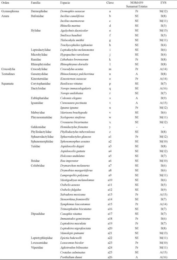 Todos los ejemplares fueron fotografiados y reconocidos a nivel de especie con las diferentes claves dicotómicas para cada grupo (Flores-Villela et al., 1995, Köhler, 2008, 2011); y con el apoyo de guías de campo ilustradas (Campbell, 1998, Lee, 2000, McCranie & Wilson, 2002, Calderón-Mandujano et al., 2005). La nomenclatura taxonómica se basó en (Adalsteinsson et al., 2009; Flores-Villela & Canseco-Márquez, 2004; Faivovich et al., 2005, 2010; Frost et al., 2006, 2009, Hynková et al., 2009 y Köhler et al., 2014). Se identificaron las especies prioritarias de anfibios y reptiles, de acuerdo a la legislación nacional (NOM-059-SEMARNAT-2010), (Diario Oficial de la Federación, 2010) e internacional (la Lista Roja de la Unión Internacional para la Conservación de la Naturaleza (UICN). Se incluyó el cálculo de vulnerabilidad de especies (EVS por sus siglas en inglés) propuesto por (Wilson et al., 2013), el cual proporciona un estatus de conservación para todas las especies en términos de su vulnerabilidad, considerando tres categorías principales para los reptiles (distribución geográfica, tipos de vegetación que ocupa y grado de persecución humana) y para los anfibios (distribución geográfica, tipo de vegetación que ocupa y modo de reproducción) estableciendo puntajes de vulnerabilidad que van de bajo (3-9), medio (10-13) a alto (14-20).