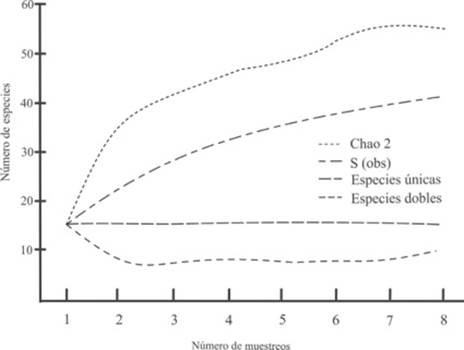 Análisis de datos. Se elaboraron curvas de acumulación de especies de manera independiente para los anfibios y reptiles con la información obtenida en campo para determinar la precisión del esfuerzo de muestreo, utilizando el estimador Chao 2 (Colwell, 2009). Adicionalmente, se tomaron en cuenta los algoritmos que emplean proporciones de especies que aparecen sólo una vez (singletons), así como las que aparecen dos veces (doubletons), en el supuesto de que cuando estas dos líneas se cruzan, el inventario es considerado completo (Jiménez-Valverde & Hortal, 2003). La curva de acumulación de especies se generó con ayuda del programa EstimateS v7.5.0 (Colwell, 2009).