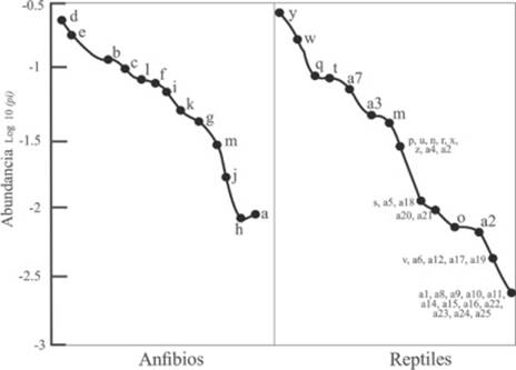 La riqueza observada en reptiles fue mayor que la de anfibios y coincide con la lista generada por (Casas-Andreu et al., 2004) para la provincia fisiográfica Costa de Oaxaca; adicionalmente, en este trabajo comprobamos que la composición de especies de la región de Chacahua y La Tuza de Monroy se caracteriza por poseer un número considerable de especies relativamente poco abundantes y una cantidad de especies con abundancia relativa alta (Gardner et al., 2007, García & Cabrera Reyes, 2008, Ricklefs, 2001).