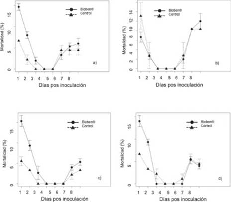 La viabilidad de la formulación de T. harzianum fue del 90.1%, por lo que los resultados obtenidos pueden considerarse confiables. El efecto causado por T. harzianum fue muy similar entre el tratamiento control y el expuesto al hongo en las tres especies de abejas y en A. ludens (Fig. 1). Para M. beecheii (F1, 6 = 7.17, P = 0.04) y A. ludens (F1, 6 = 9.54, P = 0.02) la mortalidad no fue significativa a α = 0.01. Sin embargo, la mortalidad en las abejas expuestas fue significativamente mayor en S. mexicana (F1, 6 = 19.17, P < 0.01) y A. mellifera (F1, 6 = 24.19, P < 0.01). Tanto para S. mexicana como para A. mellifera la diferencia se debió a la mortalidad en el tratamiento expuesto que fue mayor en los dos primeros días de exposición (prueba de Tukey HSD, P < 0.05). En las cuatro especies la mortalidad varió significativamente en el tiempo (F1, 6 = 19.17, P < 0.001) y fue menor a 40% en el grupo expuesto y control al terminar los 8 días de observaciones. Los datos obtenidos indicaron que Bioben(r) presentó poca actividad sobre A. ludens y las tres especies de abejas. En un trabajo previo, Mommaerts et al. (2009) reportaron baja mortalidad (<15%) en B. terrestris después de ser expuesto al biofungicida Trianum-P (formulación a base de T. harzianum cepa T22). Aunque la alta mortalidad que se observó en los primeros días en S. mexicana y A. mellifera fue sugestivo de un efecto causado por el hongo, en los días subsecuentes no se observó el mismo patrón, lo que puede significar que algunas especies fueron susceptibles a los componentes inertes de la formulación. Este es un campo poco explorado pero que merece atención, ya que hay evidencia que indica que diferentes formulaciones provocan diferentes mortalidades (Mayes et al., 2003, Mohan & Gujar, 2001). Finalmente, los resultados del presente trabajo sugieren que la formulación comercial de T. harzianum (Bioben(r)) no representa un riesgo para las abejas S. mexicana, M. beecheii y A. mellifera. Los siguientes pasos son: 1. Evaluar el efecto de este patógeno en combinación con otros plaguicidas usados para el control de plagas, a fin de descartar los posibles efectos sinérgicos que pudieran tener sobre las abejas (Iwasa et al., 2004) y 2. Determinar el efecto de los componentes de las formulaciones comerciales para evaluar su contribución a la toxicidad del compuesto.