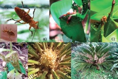 Janbechynea elongata (Fig. 1a) fue observado por primera vez en Tancoco el 10 junio de 2009, después el 6 de julio de 2010 y el 16 de junio de 2011 entre las 13:00 y 16:00 horas. En total se encontraron cerca de 42 individuos adultos en grupos de 5 a 15, algunos se alimentaban de foliolos nuevos y el raquis de 12 individuos de C. huastecorum (Fig. 1b y c) (población de más de 100 individuos) otros solo descansaban. Por las condiciones del sitio, con pendientes de entre 70° y 80° se logró la captura de 16 insectos, estos se mantuvieron en laboratorio siguiendo la técnica de Windsor et al. (1999), se observó una copulación y, sobrevivieron cerca de tres semanas. En junio de 2011 y 2012 en Chontla, se reportaron enjambres de J. elongata, que llegaron a cinco ejemplares de C. revoluta y uno de C. circinalis. El 27 de junio de 2011, solo se observaron los restos de insectos muertos en C. revoluta (Fig. 1e) ya que fueron comidos por las hormigas. En uno de los jardines, las cícadas fueron retiradas, debido a que se consideraron marchitas. En junio de 2015, en Tantima y Chontla se reportaron enjambres de J. elongata que infestaron cerca de 20 individuos de C. revoluta y dos C. circinalis. De acuerdo con los residentes, cerca de ocho individuos de C. revoluta sufrieron un daño severo por este insecto (Fig. 1f), de no ser por la aplicación de insecticidas, el daño habría sido más fuerte. Janbechynea elongata llega volando, se esconde en el tronco y las frondas. Son frecuentes por la mañana siendo más activos al salir el sol. Prefieren las cícadas con diámetro de más de 1.50 m. Siguen alimentándose de las frondas aun después de ser retiradas de la planta madre.