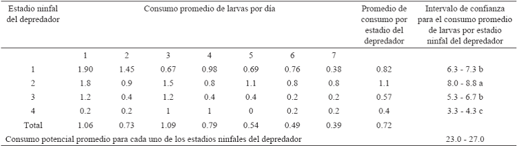 Evaluación de la capacidad depredadora de Podisus maculiventris. La capacidad de depredación de P. maculiventris sobre larvas de C. rosaceana, se evaluó de acuerdo con la metodología de Cola-Zanuncio et al. (2008), para lo cual, los especímenes de los estadios (n1-n4) de P. maculiventris se mantuvieron en inanición por 6 h previo a los ensayos. En el primer día se colocaron cinco larvas de C. rosaceana de tercer y cuarto estadio por cada espécimen de P. maculiventris. En los días posteriores el número de larvas suministradas fue variable. El ensayo se llevó a cabo en contenedores plásticos de 8 × 9 × 3 cm, y se contaron las larvas consumidas cada 24 h por 7 d. El consumo por estadio por día se analizó estadísticamente a través de intervalos de confianza, en los que la decisión fue: consumo igual con 95% de confianza entre estadios cuando se compartieron entre sí valores de los intervalos de confianza (Clifford & Taylor 2008).