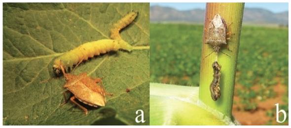 De los huertos de manzano muestreados se obtuvieron 1200 larvas de C. rosaceana, a las cuales se les realizó la exploración de parasitoides, sin tener éxitos; sin embargo, se encontró al depredador P. maculiventris alimentándose de manera natural de larvas de C. rosaceana (Fig. 1a) y S. frugiperda (Fig. 1b), en huertos de manzano y parcelas de maíz, respectivamente. Lo cual indica que este depredador podría tener potencial para controlar a otras especies de lepidópteros como S. frugiperda.