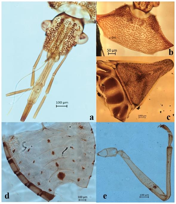 Recolecta e identificación de Podisus maculiventris . Se recolectaron 70 especímenes de P. maculiventris en diferentes etapas de desarrollo y cinco grupos de huevos, con un promedio de 21 huevos por grupo, en huertos de manzano, mientras que en parcelas de maíz se encontraron 17 adultos y 17 grupos de huevos, con un promedio de 22 huevos por grupo (Cuadro 1). Los especímenes presentaron las características morfológicas: proboscis muy gruesa y antenas de un solo color (Fig. 2a), húmeros agudos espinosos (Fig. 2b), la punta del escutelo triangular proyectado hacia atrás entre las alas y es redondeada (Fig. 2c), esterno pálido con pequeñas manchas y último esternito abdominal de la hembra con una gran mancha (Fig. 2d) y fémur con un par de puntos anteapicales (Fig. 2e), mismas que de acuerdo con claves taxonómicas y pictóricas (Ortega-León 1997, Capinera 2008, Universidad de Florida s/a, Rider 2012), coincidieron con las descritas para Podisus maculiventris (Say).