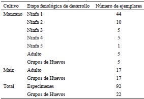 Recolecta e identificación de Podisus maculiventris. Se recolectaron ejemplares de P. maculiventris (Hemiptera: Pentatomidae) en agosto y septiembre de 2014, en un huerto de manzano y una parcela de maíz ubicados en El Terrero, Namiquipa (29° 18' 84" N; 107° 44' 21" O) (Cuadro 1) y se depositaron en contenedores plásticos de 1 oz de capacidad con una larva de C. rosaceana o Spodoptera frugiperda (Lepidoptera: Noctuidae), para su trasladado al Laboratorio de Patología Vegetal y Control Biológico del CIAD, Unidad Cuauhtémoc. Los ejemplares recolectados se mantuvieron bajo condiciones de laboratorio antes mencionadas, alimentados con larvas de C. rosaceana, S. frugiperda o Tenebrio molitor (Coleoptera: Tenebrionidae), criadas en laboratorio. La identificación de P. maculiventris se llevó a cabo mediante claves taxonómicas y pictóricas (Ortega-León 1997, Capinera 2008, Universidad de Florida s/a, Rider 2012). La confirmación de la especie fue hecha por la M.C. Guillermina Ortega Léon (Instituto de Biología, Departamento de Zoología, Universidad Nacional Autónoma de México, Ciudad de México). Ejemplares de P. maculiventris se depositaron en la colección de insectos del Instituto de Biología de la UNAM (CNIN).