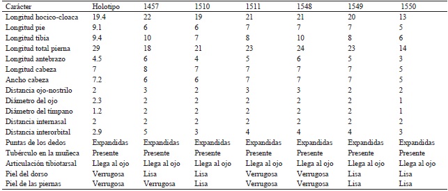 En el presente estudio se reporta el primer registro de la rana chirriadora del Nevado de Colima (E. nivicolimae) para el estado de Michoacán (Fig. 1) resultado de dos muestreos de campo realizados en el municipio de Chinicuila en 2013 y 2014, utilizando el método de búsqueda intensiva. Todos los ejemplares fueron conservados en alcohol al 70% y depositados en la Colección Herpetológica de la Universidad Michoacana (CHUM). Las coordenadas aparecen en grados decimales con datum de referencia WGS84 y la altitud en msnm. El 24 de julio del 2013 se colectaron tres machos adultos de E. nivicolimae, estos individuos se encontraban vocalizando sobre árboles de aguacate bordeados por bosque de pino en la localidad de El Resumidero, Chinicuila, Michoacán (CHUM 1457, 1510, 1511; 18.693670 N, -103.415604 O) a 1524 msnm. El 24 de agosto del 2014 se colectaron tres machos adultos de E. nivicolimae, los cuales se encontraban vocalizando sobre árboles de aguacate y sobre arbustos, bordeados por bosque de pino en la localidad de El Resumidero, Chinicuila, Michoacán (CHUM 1548, 1549, 1550; 18.69986 N, -103.40772 O) a 1370 msnm. Debido al limitado número de ejemplares de esta epecie descritos en la literatura (Reyes-Velasco et al. 2015 para una revisión) presentamos valores de algunos caracteres morfológicos y morfométricos de los ejemplares registrados en el presente estudio (Cuadro 1).