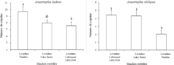 Anastrepha ludens. Los resultados del estudio en jaulas de campo no indicaron efecto significativo de las levaduras Lallemand LB12163b y Nutribio con respecto al control en el desempeño sexual de los machos estériles con hembras de cría fértiles (gl=2,27; F=3.275; P<0.05).
