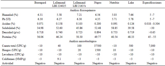 El análisis fisicoquímico indicó que las levaduras Borregard, Lallemand LBI 2240-25, Lallemand LBI 2163 b y Lake cumplen con las especificaciones establecidas en el Manual de Control de Calidad de la Planta Moscafrut. El extracto de levadura Nupro presentó un pH de 4.35, quedando fuera de las especificaciones. La levadura Nutribio presentó 40.5% de proteína quedando por debajo del valor mínimo de referencia (Cuadro 1). El análisis microbiológico determinó para Nupro cargas de 37,500 y 1,500 UFC/g para cuenta total y hongos, respectivamente, los cuales son altos en comparación con los valores de referencia de 10,000 y 50 UFC/g, respectivamente. La levadura Lallemand LBI 224025 presentó 9.1 UFC/g para su cuenta de coliformes, el valor de referencia es <3 (Cuadro 1).