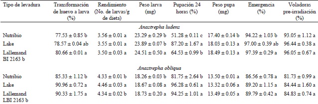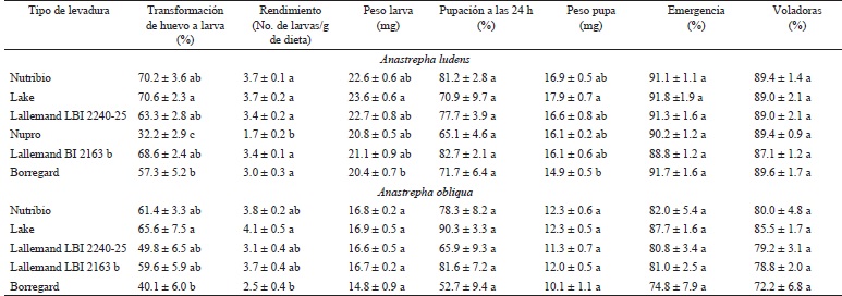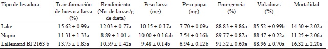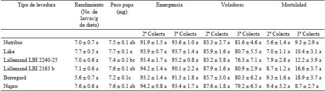 Anastrepha ludens. Los valores mayores de rendimiento (F=17.64; g.l.=5,71; P<0.001) fueron obtenidos con la levadura Lake States. La mayor transformación de huevo a larva (F=21.31; g.l.=5,71; P<0.001) fue obtenida con dietas preparadas con levaduras Lake States, Nutribio, Lallemand LBI 2163b, Lallemand LBI 224025 y Borregard. Los valores mayores de peso de la larva (F=2.68; g.l.=5,71; P=0.0291) y peso de la pupa (F=2.87; g.l.=5,71; P=0.0208) fueron obtenidos con dietas preparadas con levadura Lake States. La pupación 24 h (F=2.26; g.l.=5,71; P=0.0581), emergencia (F=0.76; g.l.=5,71; P=0.5757) y voladoras (F=0.43; g.l.=5,71; P=0.8250) no presentaron diferencia significativa (Cuadro 2).