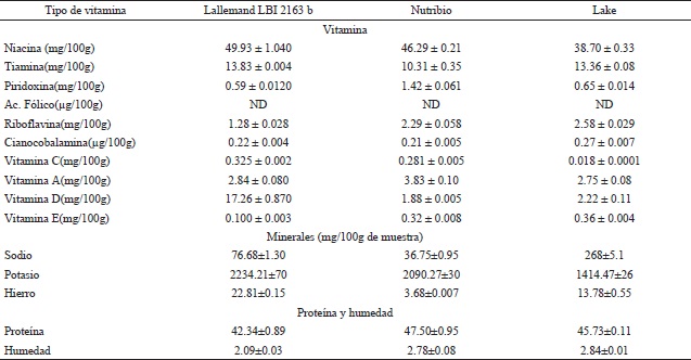 El contenido de vitaminas y el perfil de aminoácidos de las muestras de levaduras utilizadas para la evaluación a nivel semi-masivo en la elaboración de dietas para el desarrollo larvario de A. ludens, A. obliqua y C. capitata se describen en los Cuadros 4 y 5.