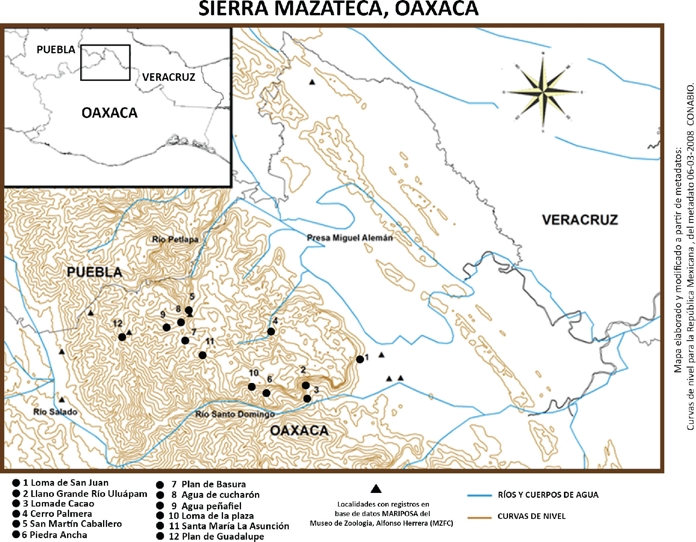 El estado de Oaxaca ha sido atractivo para los exploradores naturalistas desde finales del siglo XIX y principios del XX (Godman & Salvin, 1878-1901; Seitz, 1907-1924, entre otros). Hoffmann (1976) añadió 180 especies para Oaxaca a las 160 previamente conocidas, para obtener un total de 340 especies para este estado (Luis-Martínez et al., 1991). Otro referente importante es el trabajo Luis et al. (1991) en el que realizan un estudio sistemático sobre Papilionoidea en la Sierra de Juárez en Oaxaca, integrando 452 especies. Asímismo, Luis et al. (2004) reunieron 25,000 registros para todo el estado de Oaxaca; sumando 491 localidades de muestreo con 1,103 especies y 94 subespecies con un total de 1,197 taxones. De estos, sólo 302 registros (en 112 taxones) pertenecen a 9 localidades de la Sierra Mazateca (Fig. 1). Y más recientemente se publicó un trabajo sobre los avances faunísticos sobre los Papilionoidea del estado de Oaxaca; en este se presenta una lista de 1331 taxones a nivel específico, repartidos en 462 generos, 24 subfamilias y y seis familias de Papilionoidea (sensu lato) del estado de Oaxaca. Esta lista tiene un énfasis en 3 areas geográficas del estado, la región de A) valle de Cuicatlán, que colinda con la Sierra Mazateca hacia el este, B) región Mixe, y C) región Loxicha (Luis-Martinez et al., 2016).