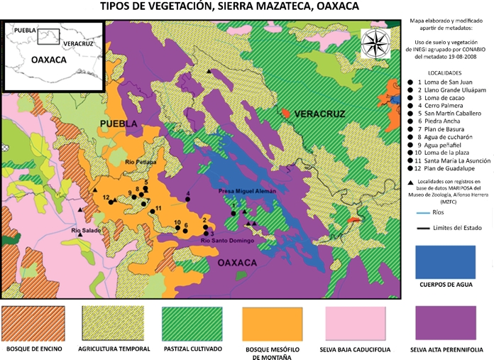 Método. El área de estudio se encuentra dentro del distrito de Teotitlán. La elección de las localidades se hizo tomando los siguientes criterios: fácil acceso, grado de perturbación bajo, que estén dentro de un gradiente altitudinal entre 100 y 2500, y abarcar los principales tipos de vegetación (bosque mesófilo de montaña, bosque caducifolio, selva alta perennifolia y bosques de pino encino) (Tabla 1, Fig. 2). Se realizaron siete salidas de campo (una por mes) que duraron de cinco a seis días, completando 35 días de recolectas, abarcando los meses de junio a diciembre de 2010 y mayo del 2011, que incluye la temporada de mayor riqueza de mariposas (Vargas et al., 1999).