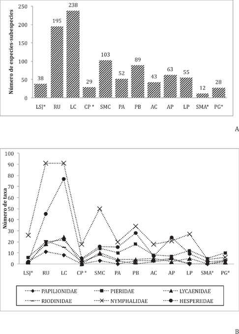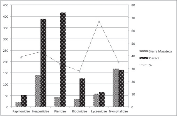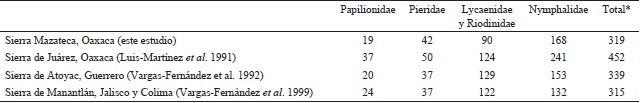 Con respecto a otras Sierras del país, como la Sierra de Juárez, Oaxaca (Luis et al., 1991, 2016) (Tabla 5), la Sierra Mazateca tuvo menor riqueza de especies, sin embargo, cabe mencionar que en este estudio no se muestreó durante todo el año, por lo que podría esperarse que aumentara el número de especies en el área, si se considera que hay especies estacionalmente asociadas. En comparación con la Sierra de Atoyac, Guerrero (Vargas et al., 1992) y la Sierra de Manantlán en Jalisco y Colima, (Vargas et al., 1999), la Sierra Mazateca presentó un número similar de especies a pesar del menor esfuerzo de recolecta. También cabe mencionar que la familia menos representada con respecto a la Sierra de Juárez fue Nymphalidae, sierra con características de vegetación y climas similares, por lo tanto se esperaba que el número de especies fuera similar, aunque la Sierra de Juárez abarca una extensión más amplia. La familia Hesperidae, no fue considerada en los otros trabajos, por lo que se necesitan más estudios con fines de comparación, pues muchos estudios de inventarios no incluyen a esta familia.