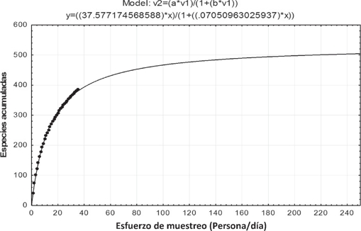 En la estimación de la riqueza específica del área estudiada, se empleó la construcción de una curva de acumulación de especies, conforme al modelo descrito por Soberón & Llorente (1993), empleando los programas EstimateS 8.0 (Colwell, 2006) y Statistica (StatSoft, 1998). El proceso consistió en aleatorizar los datos con el programa para evitar que al añadir las muestras, el orden afectara la forma de la curva (Moreno, 2001; Jiménez-Valverde & Hortal, 2003).