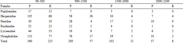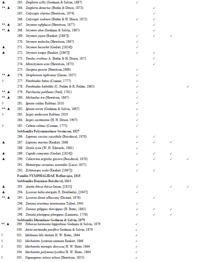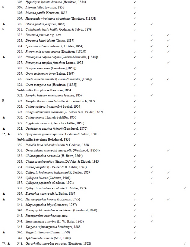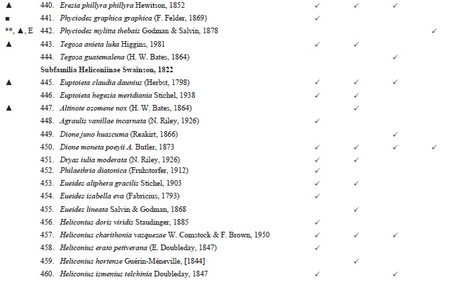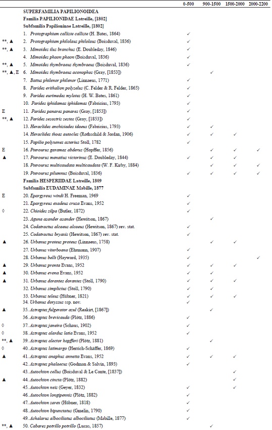 Reportamos casos en los que en el gradiente altitudinal se encontraron dos subespecies de la misma especie. En el caso de Parides panares lycimenes (Boisduval, 1870) se trata de dos ejemplares (número de catálogo: 365108 y 365109) en la base de datos MARIPOSA, del Museo Alfonso Herrera, de la Facultad de Ciencias, provenientes de la localidad de Jalapa de Díaz, Oaxaca. Esta subespecie solo se distribuye desde Chiapas a Panamá y pensamos que posiblemente está erróneamente determinado, por lo que no la añadimos a la lista, solamente conservamos la subespecie nominal. Mantenemos dos casos en los que sí pensamos que las dos formas están presentes en el gradiente, aunque no en los mismos pisos altitudinales o hábitats. El primer par son: Enantia mazai diazi Llorente, 1884 y Enantia mazai mazaiLlorente, 1984, las cuales con base a un estudio aún no publicado usando caracteres moleculares parece que se trata de la misma subespecie (C. Pozo, com. pers.). El segundo par es: Catasticta teutila teutila (Doubleday, 1847) y Catasticta teutila flavifasciata Beutelspacher, 1986, donde en la primera los 13 ejemplares presentan los puntos y líneas en su vista ventral de color anaranjado, tal como se ha señalado en su descripción, mientras que en la segunda, el ejemplar presentó la coloración amarilla de los puntos y líneas en su vista ventral, como se menciona en la descripción como principal carácter para separarla de la subespecie típica.